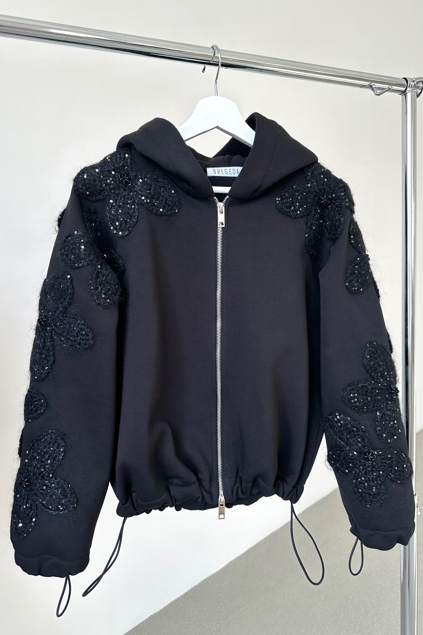 Худи на молнии из футера с начесом с цветочным декором из вязаных мотивов, пайеток и бисера.