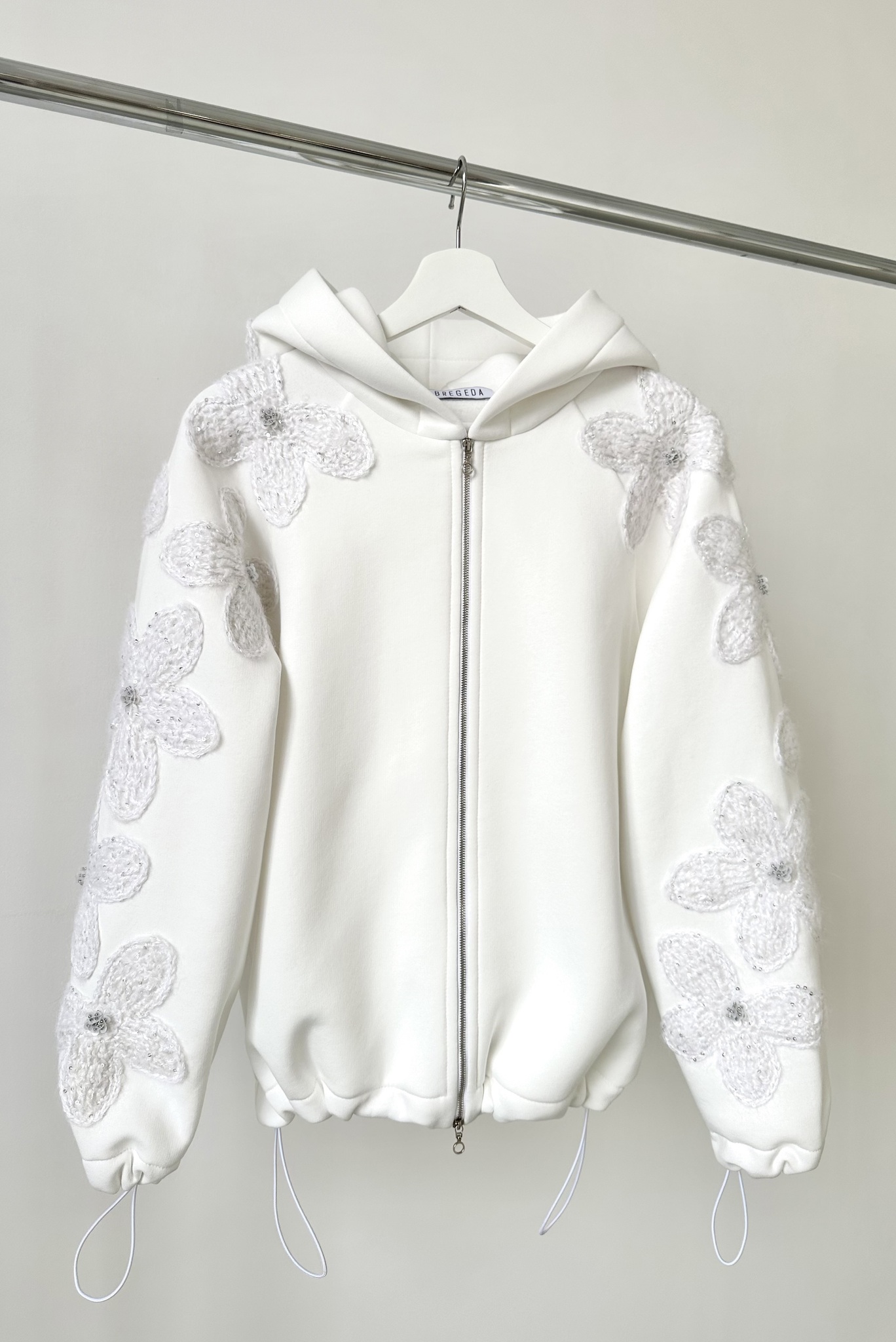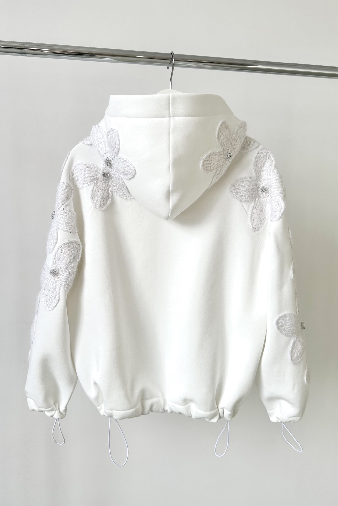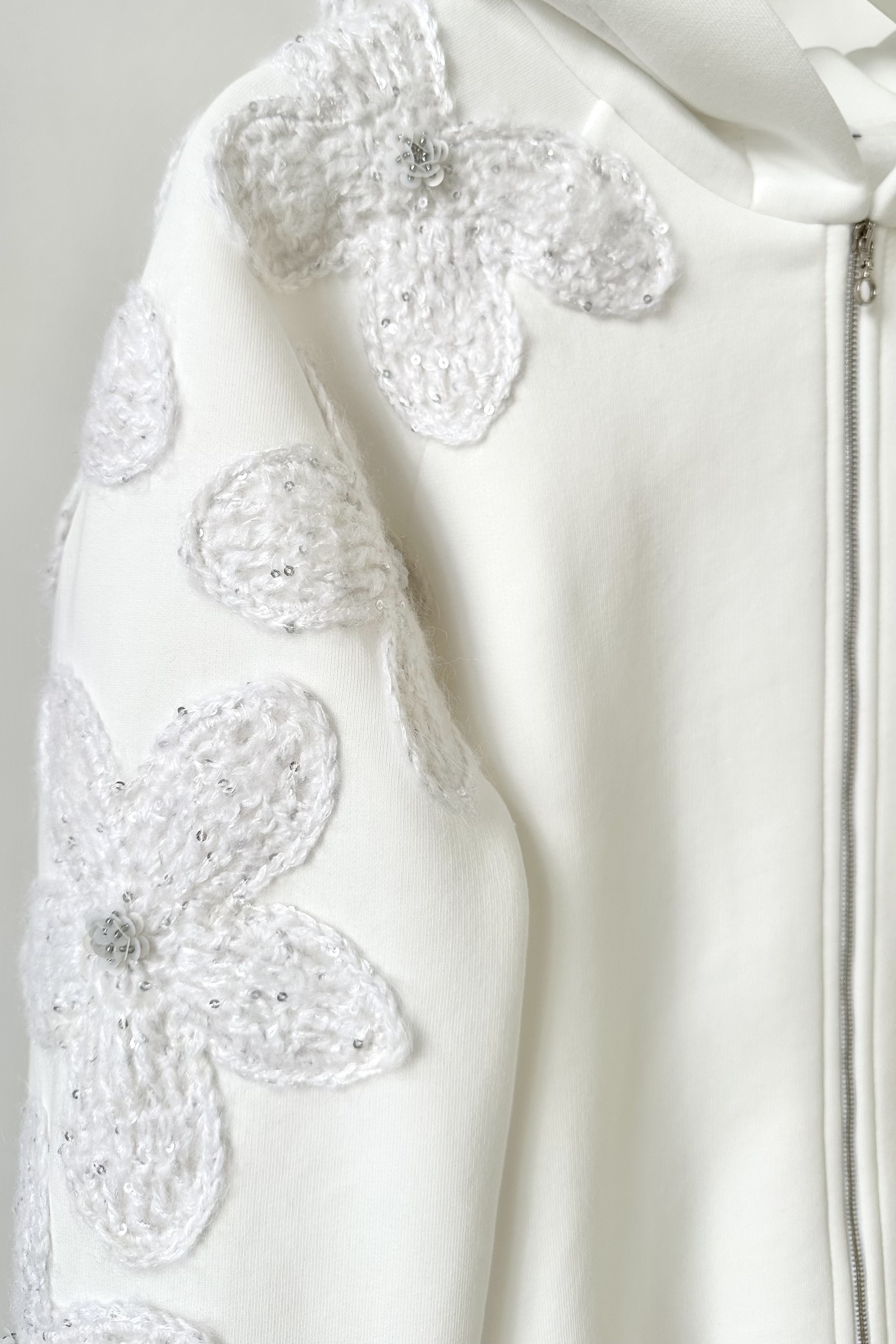 Худи на молнии из футера без начеса с цветочным декором из вязаных мотивов и бусин.