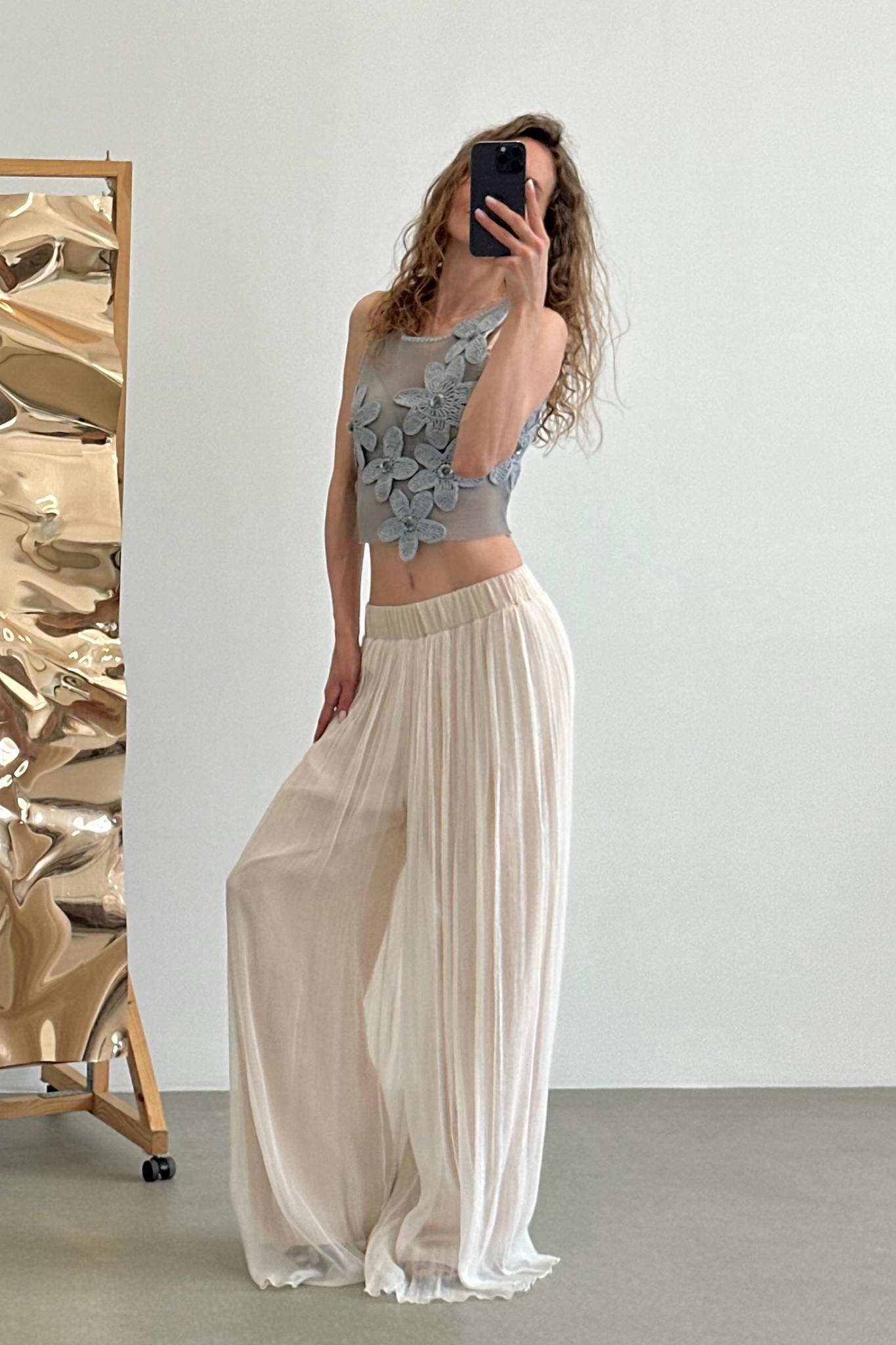 Пояс на аккуратной эластичной широкой резинке. Все срезы обработаны деликатным московским швом. Подкладка из вискозы в бежевом цвете, приятная к телу. Для этого изделия мы использовали итальянский шелк с жатой фактурой - крэш.